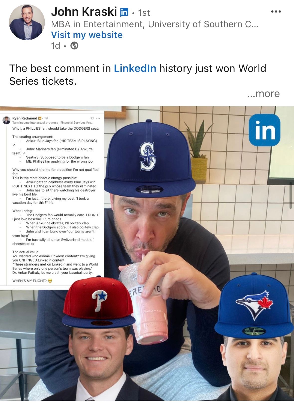 This week’s spotlight features LinkedIn legend John Kraski. Earlier this week, John posted a challenge to invite one of his followers on LinkedIn to join him and his colleague at the Jays vs. Dodgers World Series game in LA.
